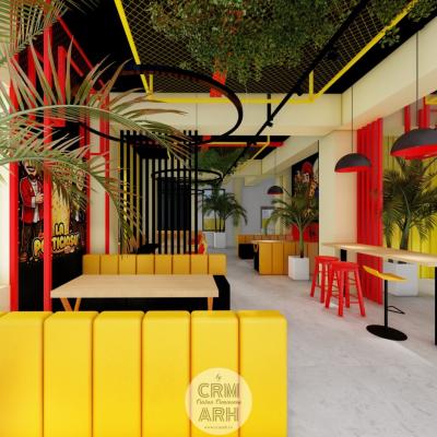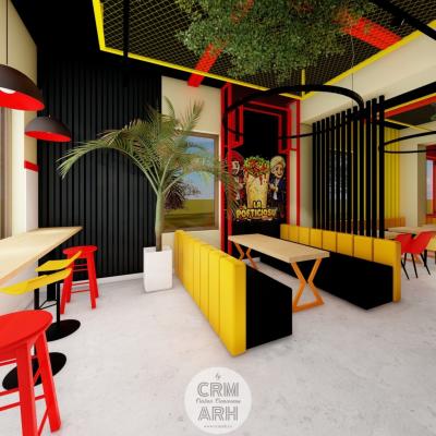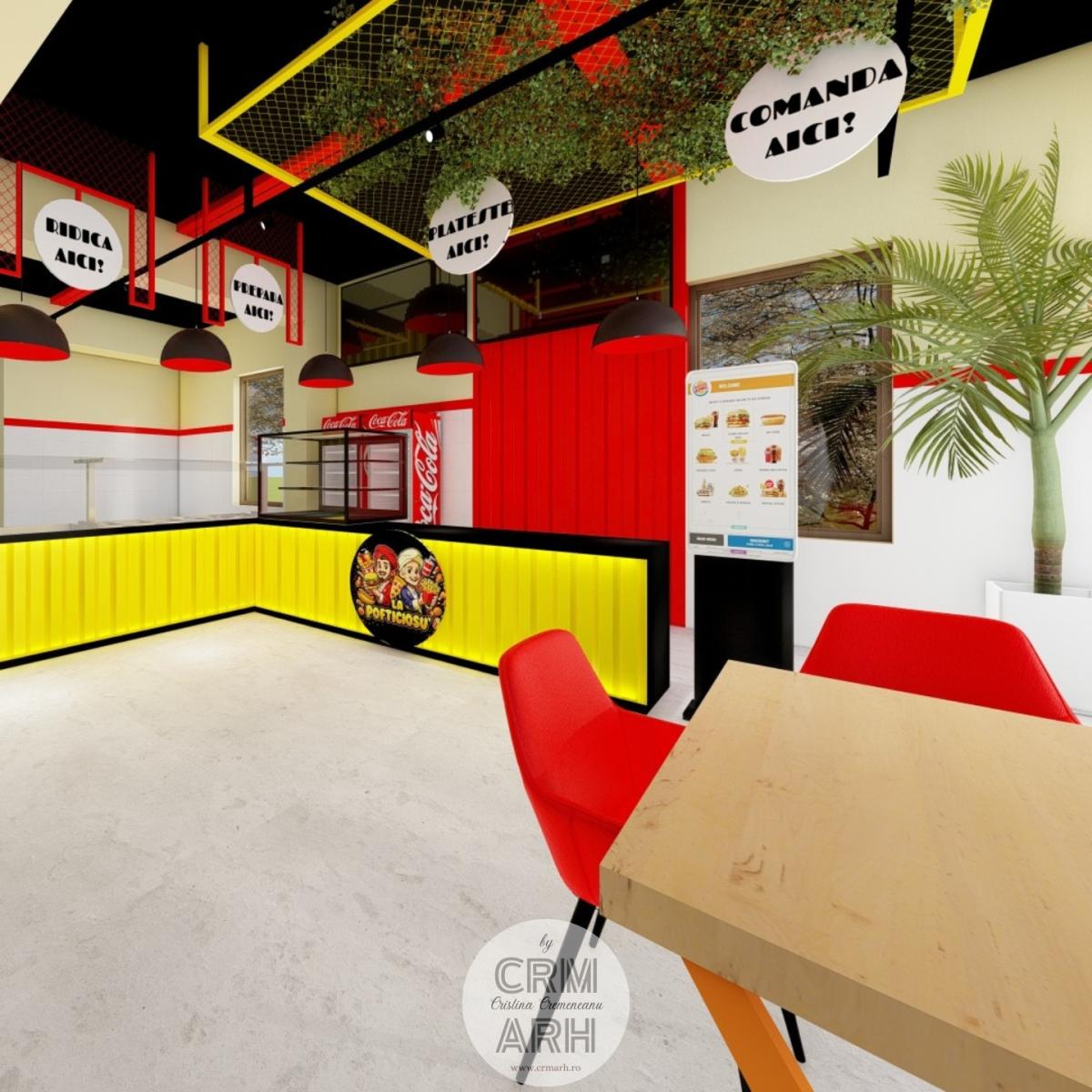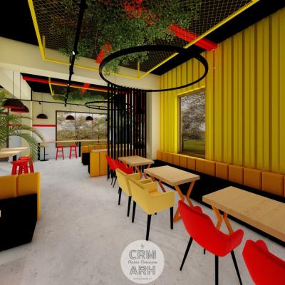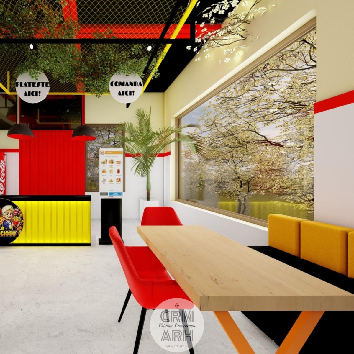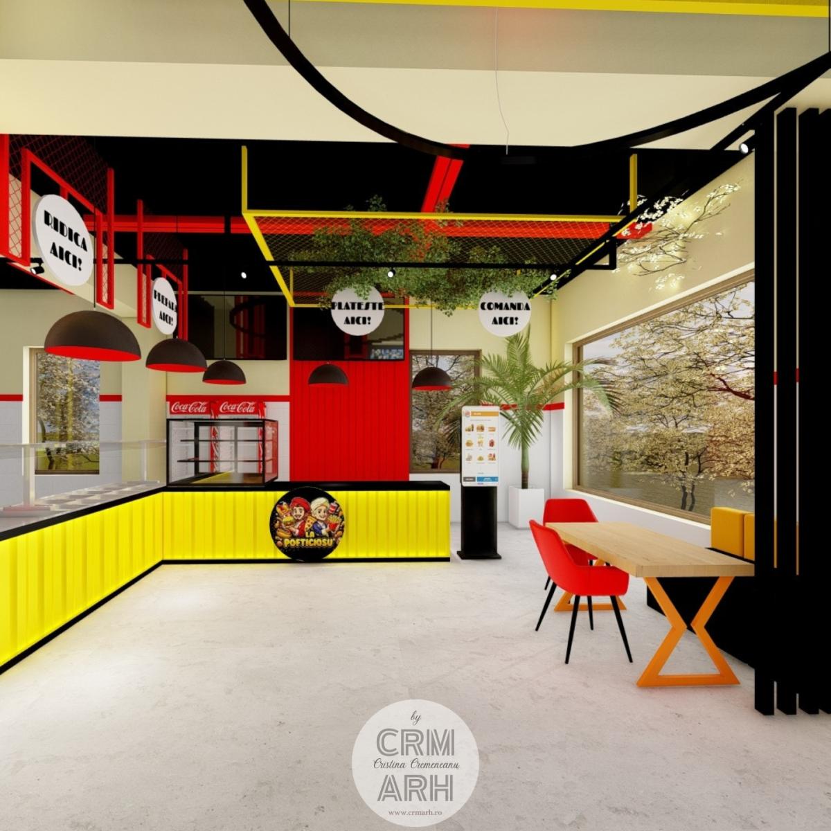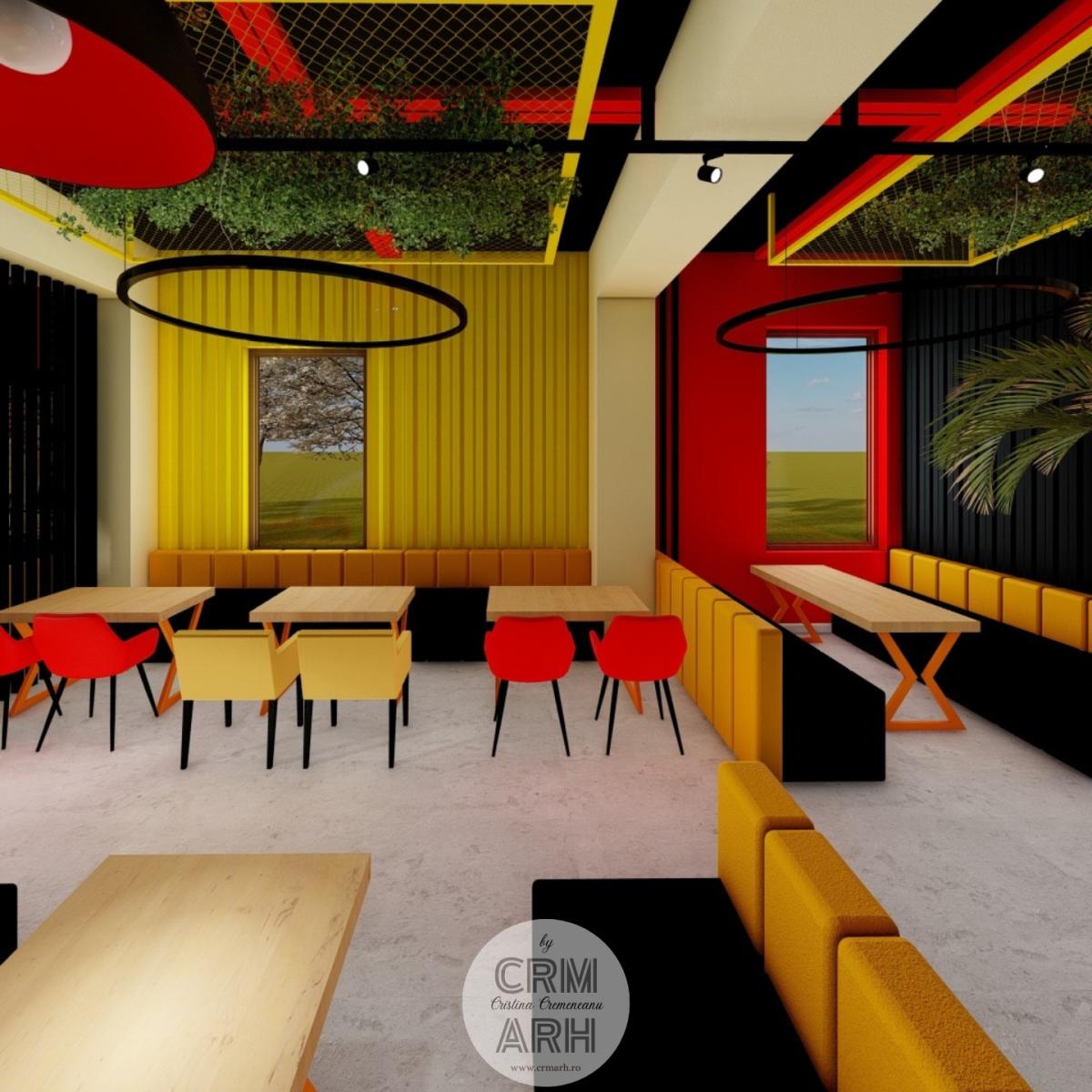 Designul se bazează pe o atmosferă urbană, energică și prietenoasă, cu o paletă de culori vii – galben, roșu, și verde – combinate cu gri și negru industrial. Pereții placați cu tablă colorată în modele „patchwork”, iar riflajele metalice sunt folosite pentru separarea vizuală a zonelor. Zona de servire se evidențiază prin panouri metalice cu perforații și neonuri cu logo-ul sau mesaje amuzante, creând un punct focal atractiv. Podeaua din beton șlefuit menține look-ul industrial. Iluminatul include pendule metalice, spoturi LED direcționate și accente neon colorate, evidențiind zonele importante și creând un efect dinamic. Decorul este completat de elemente grafice tematice fast-food, verdeață suspendată și detalii colorate care aduc energie și personalitate spațiului, integrând funcționalitatea cu estetica urban-industrială.