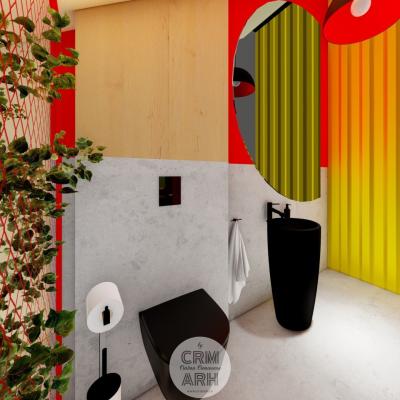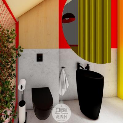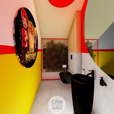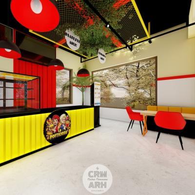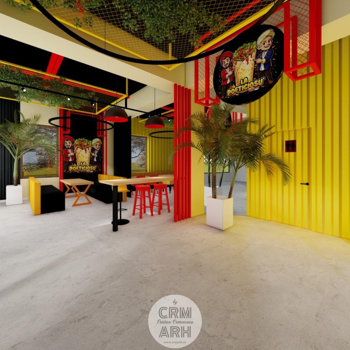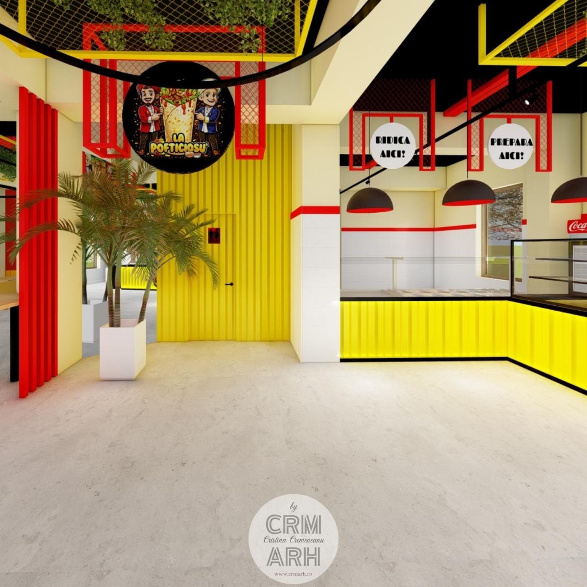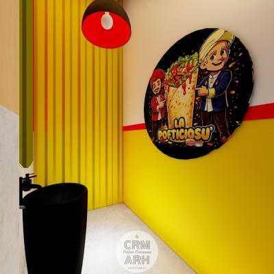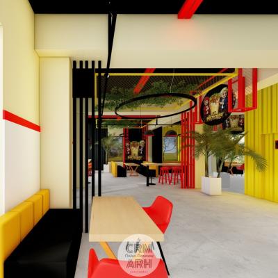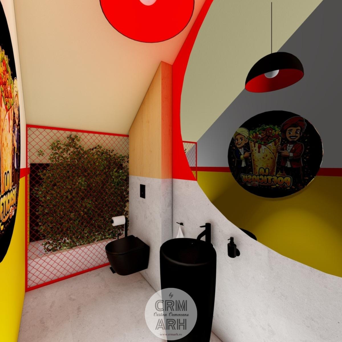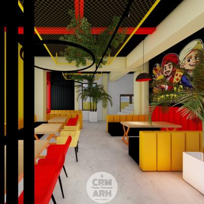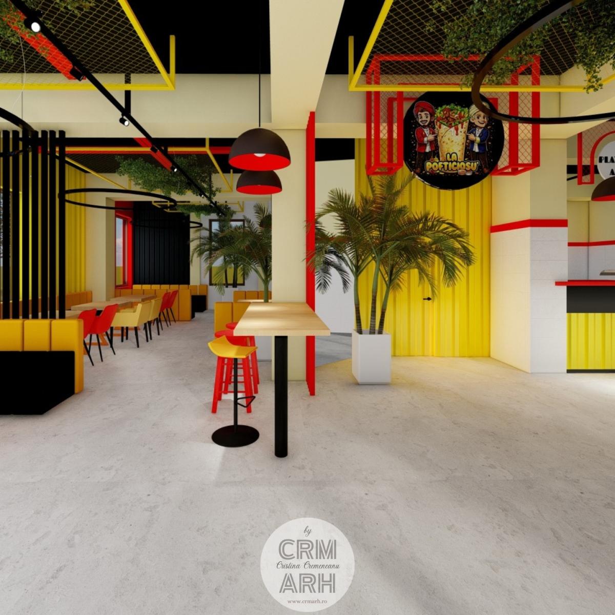Designul se bazează pe o atmosferă urbană, energică și prietenoasă, cu o paletă de culori vii – galben, roșu, și verde – combinate cu gri și negru industrial. Pereții placați cu tablă colorată în modele „patchwork”, iar riflajele metalice sunt folosite pentru separarea vizuală a zonelor. Zona de servire se evidențiază prin panouri metalice cu perforații și neonuri cu logo-ul sau mesaje amuzante, creând un punct focal atractiv. Podeaua din beton șlefuit menține look-ul industrial. Iluminatul include pendule metalice, spoturi LED direcționate și accente neon colorate, evidențiind zonele importante și creând un efect dinamic. Decorul este completat de elemente grafice tematice fast-food, verdeață suspendată și detalii colorate care aduc energie și personalitate spațiului, integrând funcționalitatea cu estetica urban-industrială.